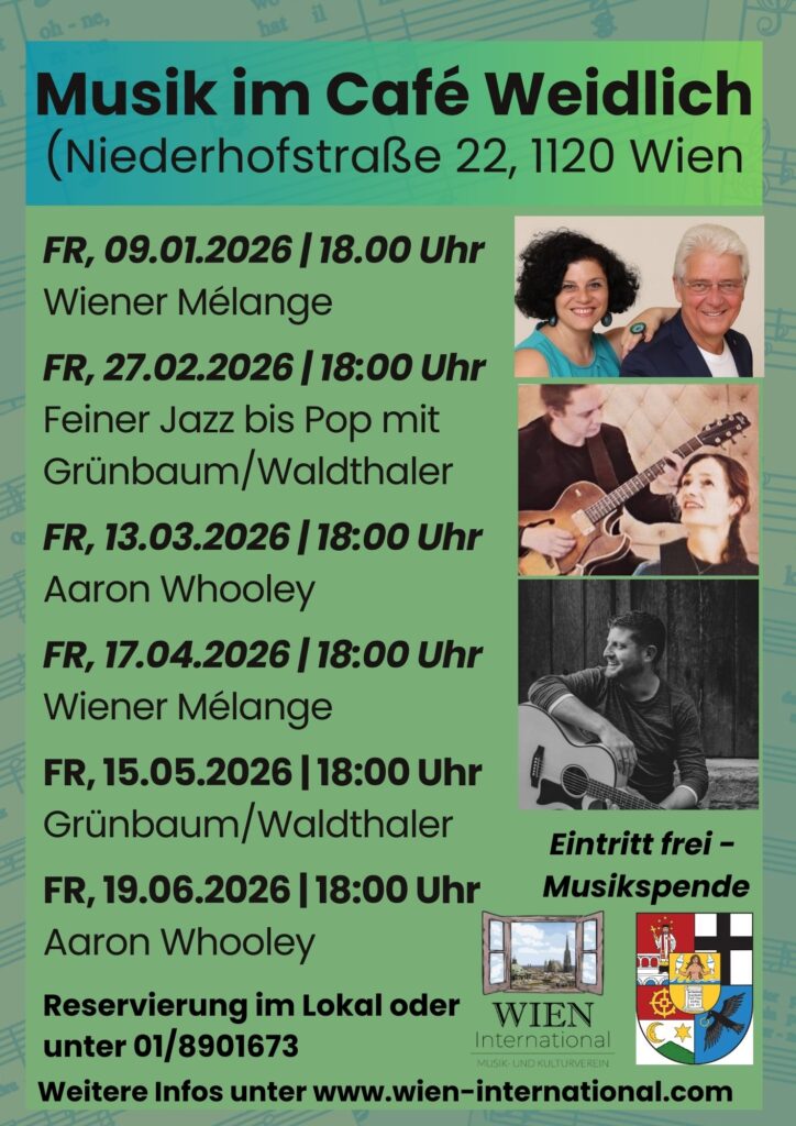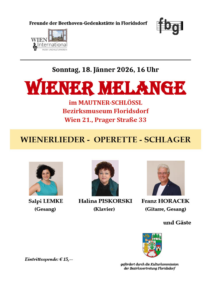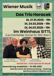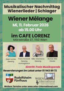 Wiener Musik vom Feinsten (Neue und bekannte Wienerlieder, Schlager, Evergreens) – Mitreißende Musik und feinster Schmäh aus Wien. Gespielt werden auch neue Wiener Lieder von Gerhard Blaboll, Tzveta Dimitrova, Salpi Lemke, Franz Horacek, Ada Stefan, uvm.